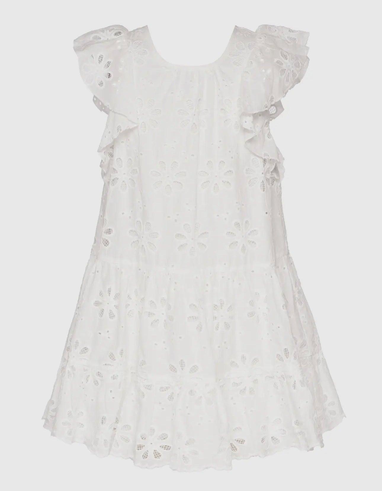 LOVE this tiered Eyelet Dress with Flutter Sleeves from Hannah Banana's spring/summer collection. This unique dress showcases our brand's commitment to fashion-forward, high-quality children's clothing. The flutter sleeves add a playful touch, making it a perfect addition to your child's wardrobe. Ideal for special occasions or everyday wear, this dress reflects your girls style perfectly!